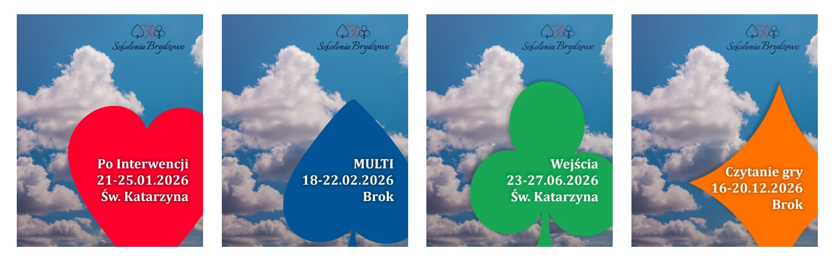 Serdecznie zapraszamy na cztery atrakcyjne szkolenia do Broku i Św. Katarzyny. Zajmiemy się bardzo aktualnymi i niezwykle przydatnymi zagadnieniami z zakresu licytacji dwustronnej, rozgrywki i wistu. Przy większym obłożeniu zaprosimy Błażeja Krawczyka (aktualny MP) i ewentualnie Macieja Kędzierskiego. Kliknięcie w poniższe banerki przenosi do artykułów ze szczegółami na dany temat.