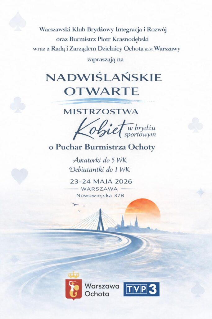 23 maja nasze Stowarzyszenie pod nazwą „Warszawski Klub Brydżowy- Integracja i Rozwój” w składzie: Magda TomMichalina OżibkoMarta Jakubisiak oraz moją osobą zaprasza Was na wyjątkowe brydżowe wydarzenie w stolicy.